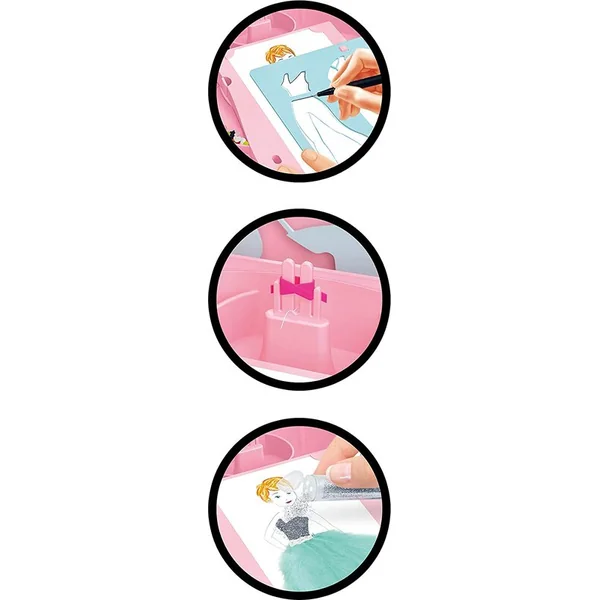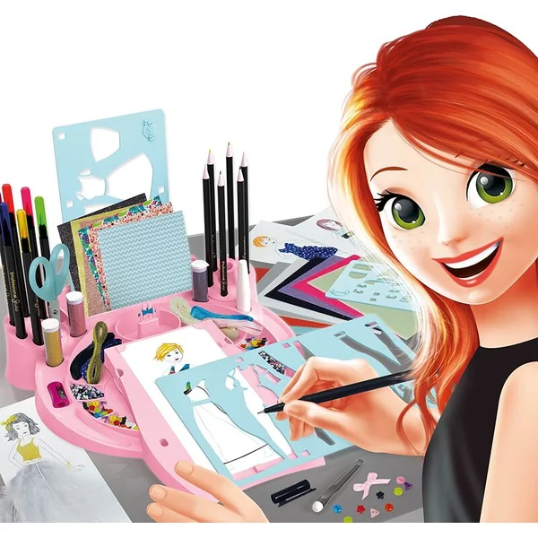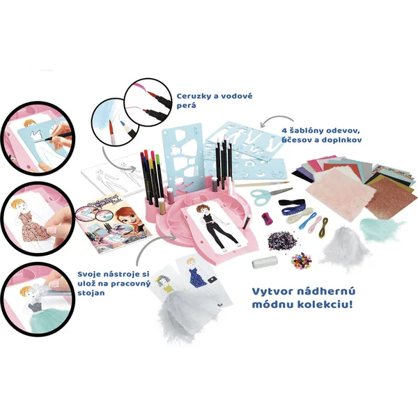 Accessoires fournis : tissu autocollant, plumes, paillettes, feutre, rubans, marqueurs, crayons aquarelle, ciseaux, taille-crayon et plus encore