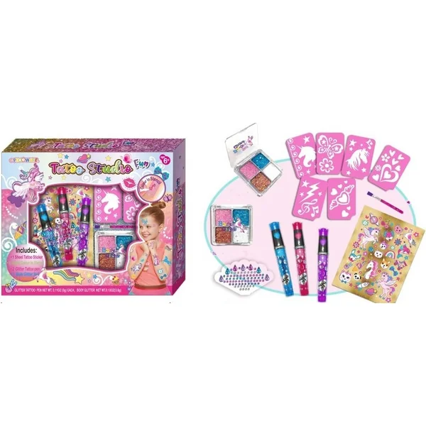 Le set comprend des tatouages, un accessoire pour les cheveux, des paillettes pour le corps, des pierres précieuses, des pochoirs, des stylos à tatouage colorés. Amuse-toi beaucoup et décore-toi ainsi que tes amis.