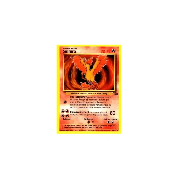Découvrez Sulfura (fo027), une carte Pokémon de l’extension Fossile, provenant du bloc Wizards. Idéale pour compléter votre collection, cette carte Rare plaira autant aux collectionneurs qu’aux joueurs.