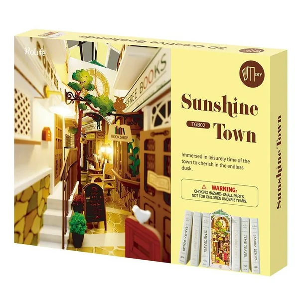 Le coin livre Robotime-Rolife Sunshine Town Book Nook TGB02 est une maison miniature créative en bois 3D à monter soi-même. Nous vous avons offert tout ce dont vous avez besoin pour construire cette scène de mini-ville – avec toutes les pièces et outils en bois, vous récupérerez progressivement toute la scène, comme les magasins, la route, les arbres, l’horloge, etc. Ce sera un jeu facile et Insert d’étagère de coin livre amusant à construire qui convient aussi bien aux enfants qu’aux adultes. Ce kit de coin livre à assembler soi-même sera également une décoration unique et exquise pour votre bibliothèque et votre bureau. Il sera également superbe lorsque vous le mettrez dans l’obscurité avec les lumières chaudes allumées.