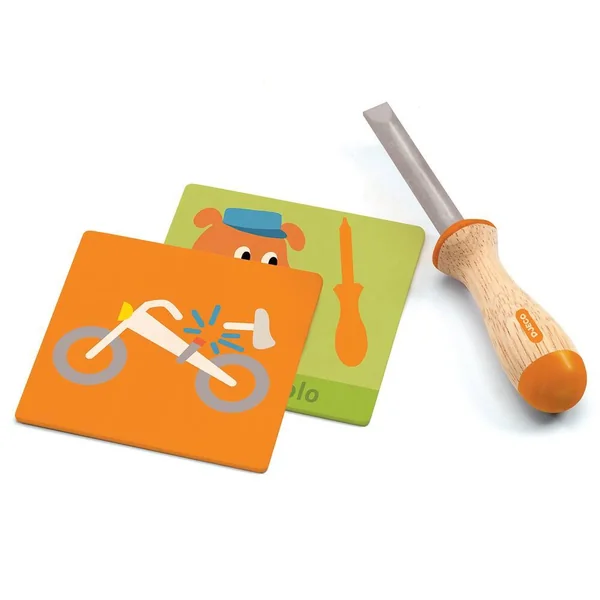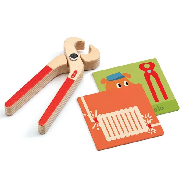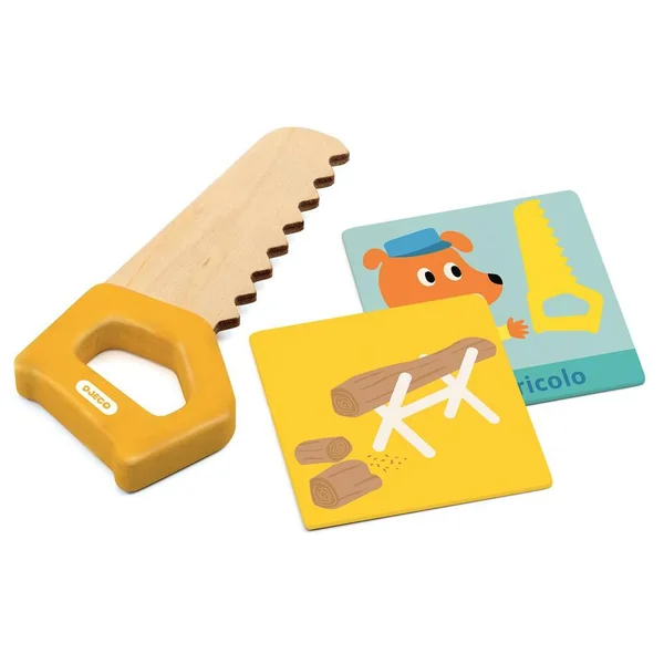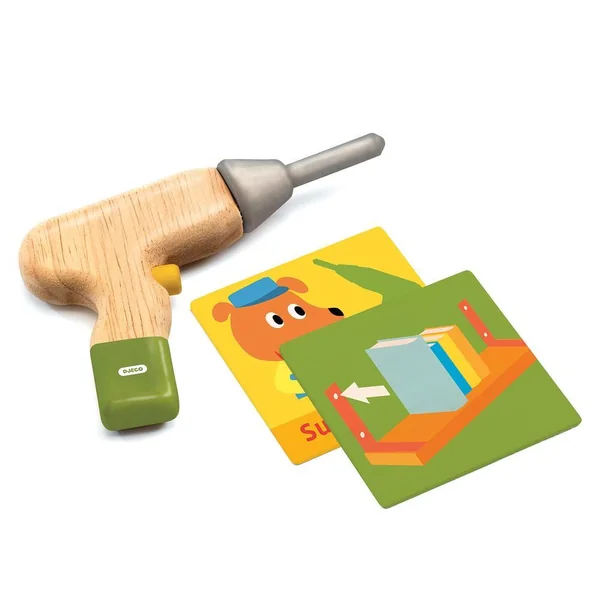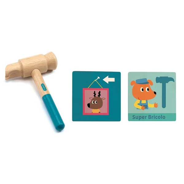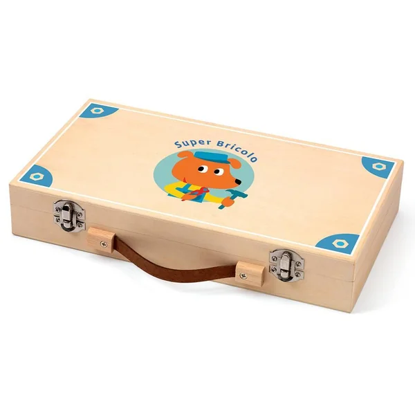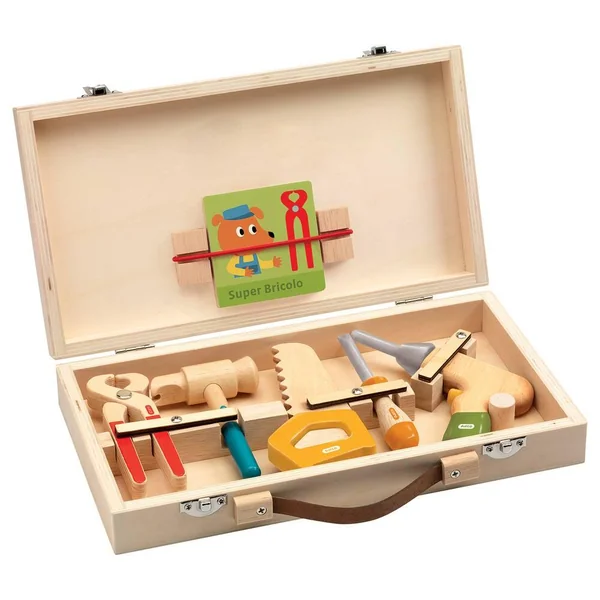SUPER BRICOLO, valise avec marteau, pince, perceuse… en bois.