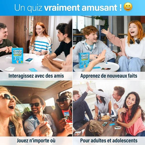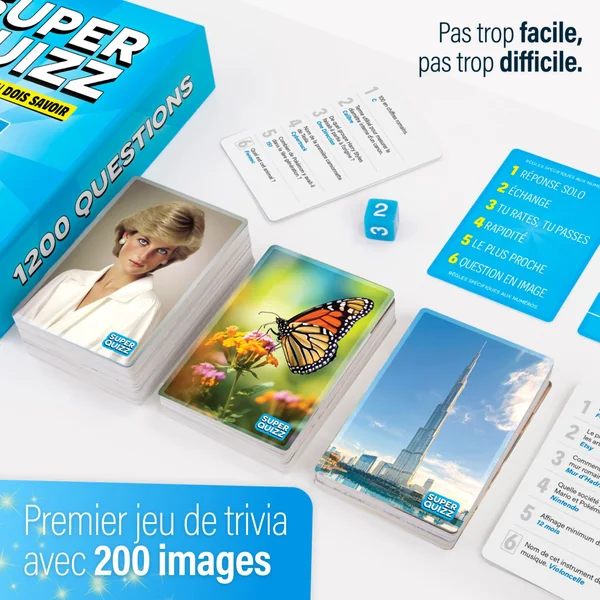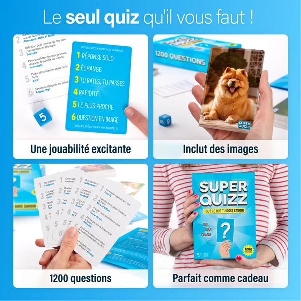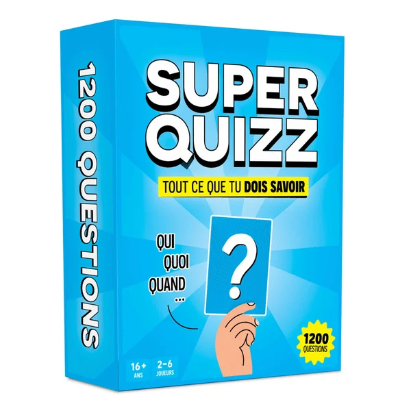 - Super Quizz est à la fois amusant et éducatif. Avec 1200 questions de culture générale, il est parfait pour des soirées de jeux en famille ou avec des amis, que vous soyez adulte ou adolescent.