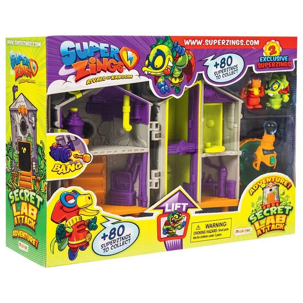 Contient 1 laboratoire avec canons, sortie secrète et ascenceur, 2 figurines et 1 véhicule à roues libres. Modèle des figurines selon disponibilité.