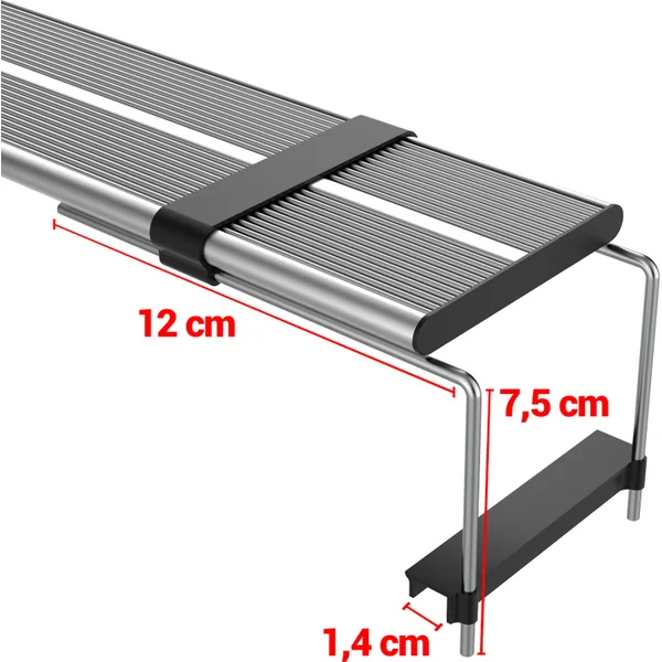 Dans ce cas, ce support réglable est fait pour vous. Alors que le support inclus dans l’emballage ne permet de régler que la longueur du luminaire, ce qui signifie qu’un plus grand luminaire peut être placé sur un aquarium plus court, mais pas sur un plus long, avec ce support coulissant, vous pouvez utiliser le luminaire Sinkor même sur des aquariums plus longs jusqu’à 20 cm (exemple : un Sinkor 2.0 de 75 cm peut également être placé sur un aquarium de 90 cm de long).