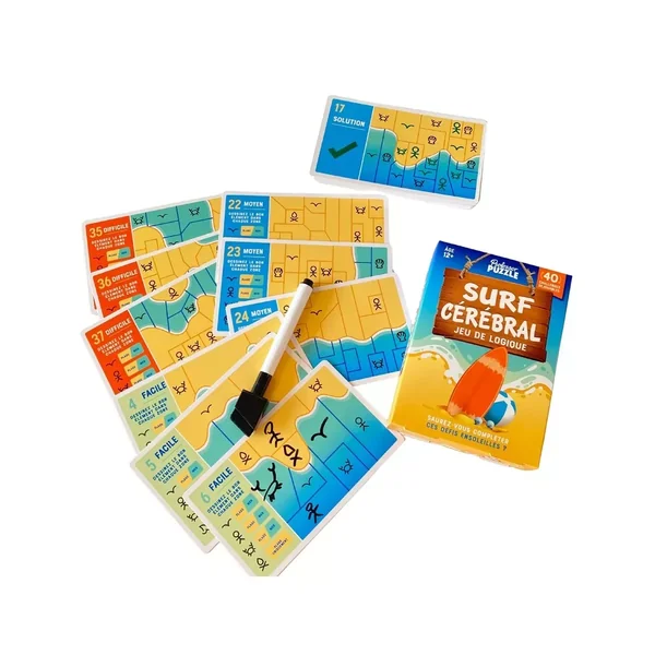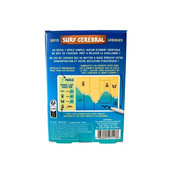 Surf Cérébral contient : 40 cartes défis rejouables et effaçables, un feutre effaçable et une règle du jeu.