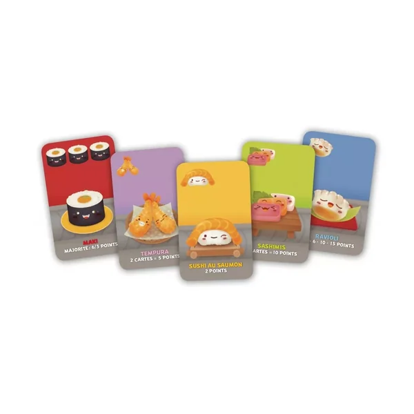 Sushi Go! est un jeu tactique de prise de risques. Pendant que les cartes Sushi passent de mains en mains entre les joueurs, choisissez quelles cartes vous placez devant vous. Collectionnerez-vous les raviolis ou tenterez-vous d’avoir le plus grand nombre de desserts ? À moins que vous ne préfériez viser les paires de tempuras ? À vous de choisir. Mais regardez bien quelles cartes prennent vos adversaires pour les contrer !
