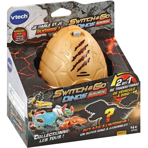 De mystérieux œufs à collectionner pour découvrir 8 modèles Switch&Go Dinos à construire soi-même ! Les Switch & Go Dinos sont des véhicules interactifs qui se transforment en créatures ! Lequel est le plus puissant ou le plus rapide ? Toutes les pièces pour construire le dinosaure sont incluses : 15 pièces en tout, dont une électronique pour déclencher des lumières et des sons réalistes. Toujours deux modes de jeux, un mode Dinosaure et un mode Véhicule, qui se déclenchent automatiquement lors de la transformation manuelle. Avec plus de 20 sons réalistes et phrases liés à l’univers des dinos et des effets lumineux. Différents modèles à collectionner : Eggirex, le T-Rex, Eggtor, le vélociraptor, Atops, le tricératops, Eggzyl, le ptérodactyle. Pile de démonstration fournie