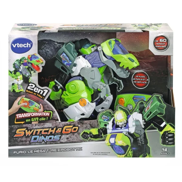 Furio, méga T-Rex robot radiocommandé. Un super T-Rex interactif qui se transforme automatiquement en méga Robot parlant ! Avec radiocommande dans les 2 modes : marche avant, arrière, droite, gauche. Un écran LCD rétro éclairé couleur : les animations sont encore plus réalistes ! Les animations dans l’écran et les voix changent automatiquement lorsque la transformation est effectuée. Des sons réalistes, des phrases liées à l’univers des dinos ou du robot et de nombreux effets lumineux. Plus de 60 phrases et effets sonores réalistes. Arrêt automatique.