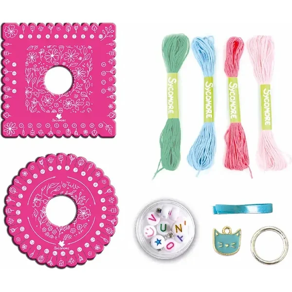 2 disques de tissage Kumihimo, 4 x fils de coton de différentes couleurs, un pendentif en forme de chat, des perles lettres colorées, des mini cubes argentés pour la décoration, un guide illustré étape par étape.
