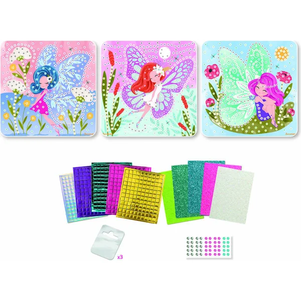 Les enfants compléteront trois magnifiques images de fées à l’aide de pierres autocollantes et de pièces de mosaïque scintillantes. Chaque détail donnera à leur création un éclat unique et une fois terminées, les enfants pourront fièrement exposer leurs œuvres – il suffit de les suspendre aux supports transparents fournis.
