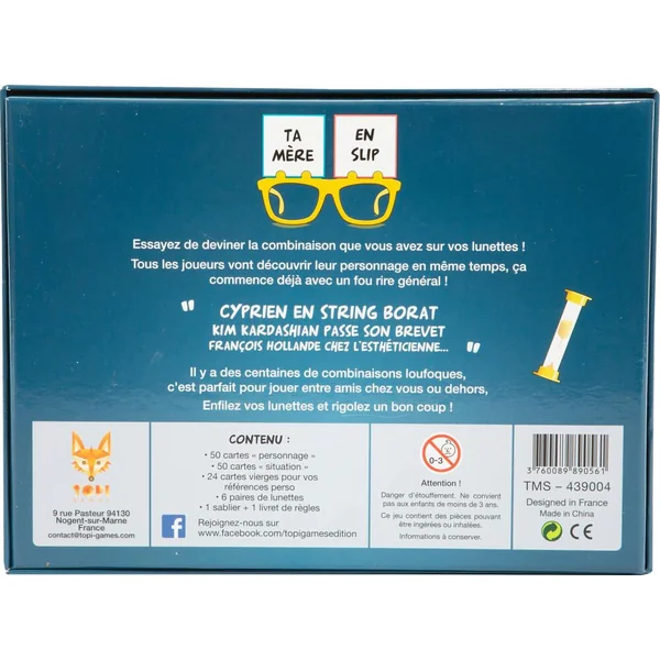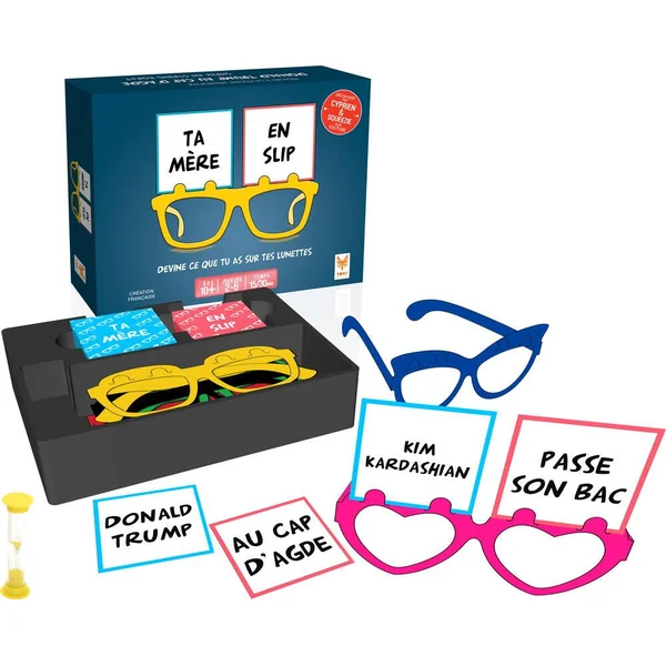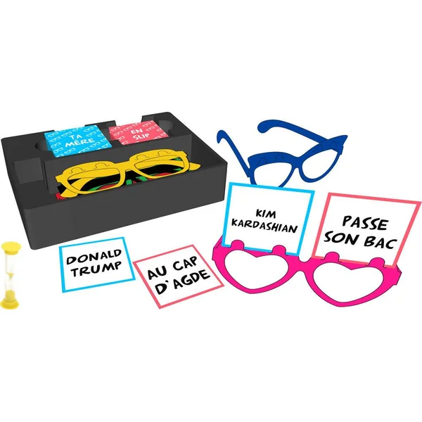La boîte contient : 50 cartes « personnage », 50 cartes « situation », 24 cartes vierges pour vos références perso, 6 paires de lunettes, un sablier et un livret de règles.