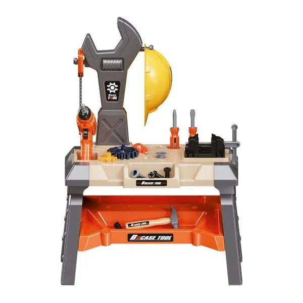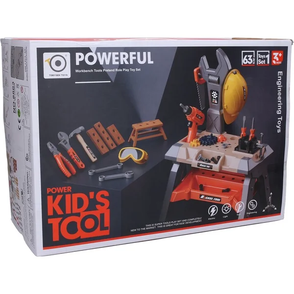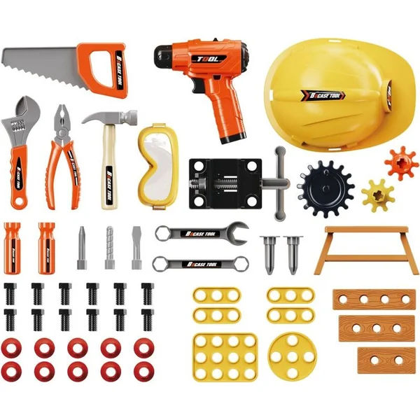 - Comprend une table, un étau, un casque, une perceuse électrique, une scie, 2 tournevis, un petit marteau, une clé à molette, des pinces, 2 clés, des lunettes de protection, une chaise, 3 roues dentées, 8 vis, 8 écrous, 2 chevilles, 3 morceaux de bois.
