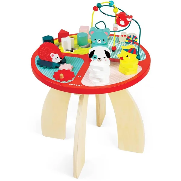 Une table multi-activités haute en couleurs avec 4 aires de jeux. 3 animaux empilables et un labyrinthe pour développer la dextérité, un système d’engrenage de 4 roues pour la coordination, 5 cubes à encastrer pour apprendre les formes et les couleurs, un boulier pour développer la concentration et la motricité. Hauteur de la table : 37 cm.