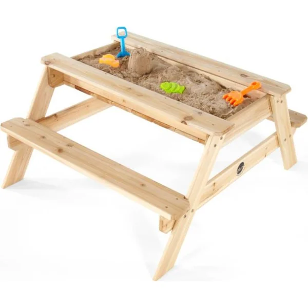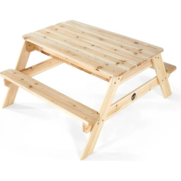 La table de pique-nique en bois 2 en 1 est une table peu encombrante adaptée à une utilisation en extérieur. En repliant le plateau, qui sert à écrire et dessiner, une surface de jeu avec du sable est créée. La table de pique-nique en bois avec bancs et bac à sable est fabriquée en bois robuste d’épicéa chinois certifié FSC.
