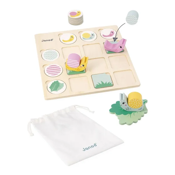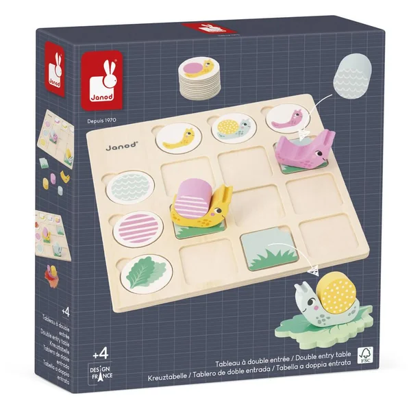 Aidez les escargots à trouver leur coquille et leur feuille de laitue préférée ! Ce jeu éducatif permettra à votre enfant de développer son esprit de logique et de se repérer dans l’espace. Ce tableau à double entrée est parfaitement adapté pour les petits. Les accessoires en volume permettront à votre enfant de mettre en relation plus facilement des caractéristiques qui se croisent en ligne et en colonne. Le jeu se compose d’un plateau en bois, 3 corps d’escargots, 12 coquilles, 3 feuilles de laitue en bois, 3 cartes en carton, et d’un sac de rangement en coton. Le tableau à double entrée est un jeu idéal pour passer un moment éducatif et amusant avec votre enfant. Jeu en bois et carton FSC™. Jeu éducatif développé en collaboration avec une professeure des écoles pour les enfants –