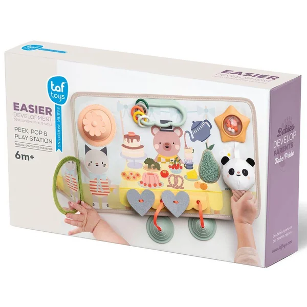 12 activités sont proposées telles qu’un miroir cache-cache, une fleur en silicone pop-up, des tirettes sensorielles en silicone et feutrine, un panda en peluche couineur, une poire en tissu tout doux, une boule avec perles ou un anneau d’activités.