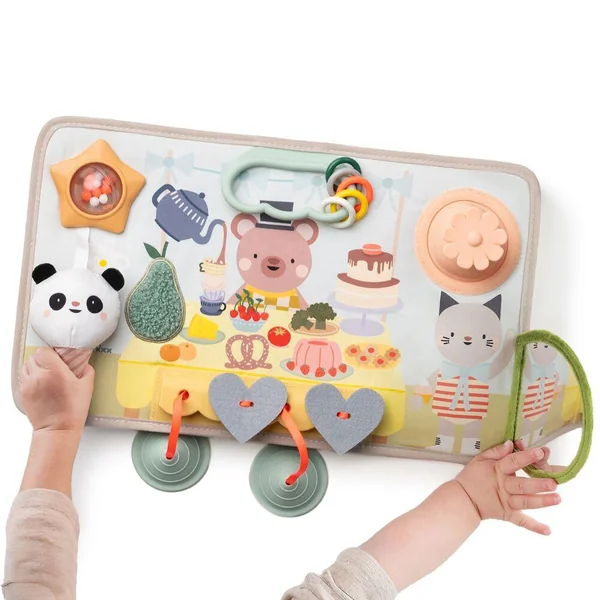 Bébé peut jouer seul ou à deux grâce au grand format du tableau, il peut jouer sur le ventre ou assis.