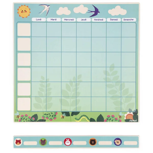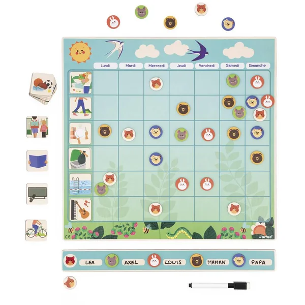 L’organisation de la famille devient un jeu d’enfant avec ce tableau d’organisation magnétique. Il va permettre à votre enfant de facilement se repérer dans la semaine et d’acquérir de l’autonomie. Ainsi, plus jamais il n’oubliera qui vient le chercher à l’école ou quel jour il va au sport. Chaque jour et en face de chaque activité l’enfant pourra disposer le magnet de l’animal qui représente le ou les membres de la famille qui participeront à cette activité. Pour cela, le set est composé de 5 animaux présents en 11 exemplaires chacun, de 7 stickers en 6 langues pour les jours de la semaine et de 20 magnets activités allant des tâches ménagères simples, aux loisirs, en passant par le sport, la musique et les anniversaires, sans oublier la sortie de l’école. Un feutre effacable est inclus pour écrire le nom de chaque personne sur la zone prévue à cet effet. Cet organisateur, est idéal pour accompagner votre enfant dans l’apprentissage de la notion du temps et de la vie quotidienne. Jouet en carton pour les enfants –