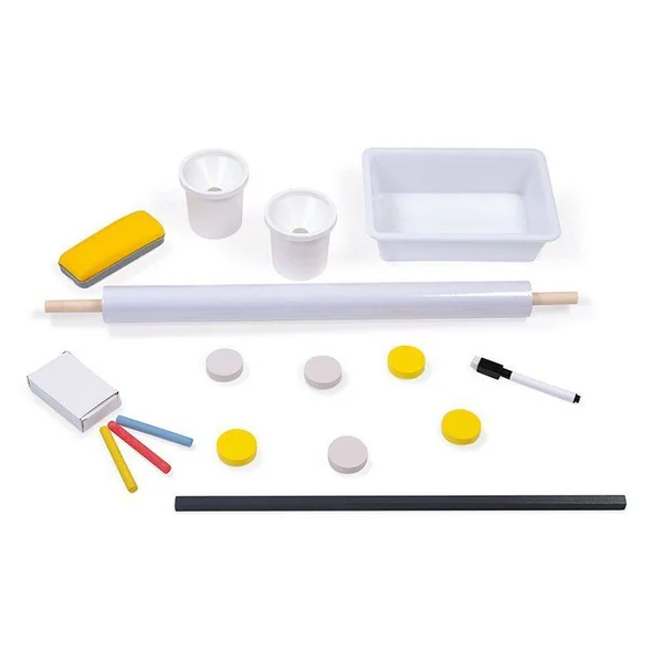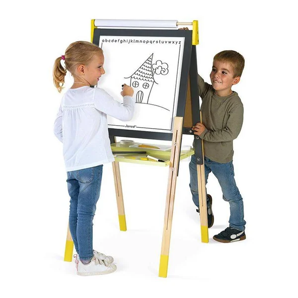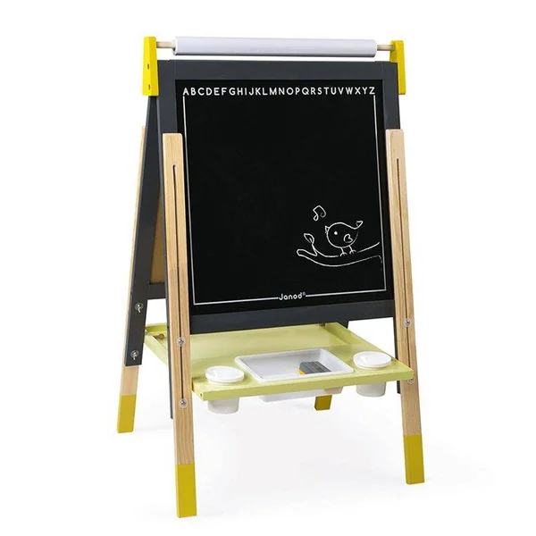 Ce tableau réglable Gris et Jaune en bois de Janod pliable et réglable est très pratique et complet pour les enfants à partir de 3 ans.