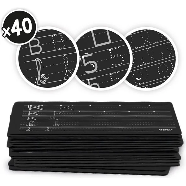 L’ensemble comprend au total 20 cartes recto-verso (26 lettres, chiffres 0-9 et 4 cartes de lignes).