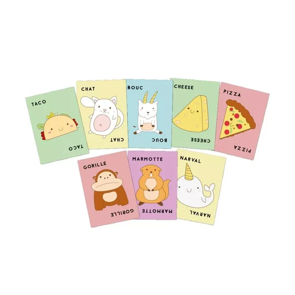 Le jeu continue ainsi en alternant, toujours dans l’ordre, les mots “Taco”, “Chat”, “Bouc”, “Cheese”, “Pizza”, “Taco”, “Chat”, “Bouc”, “Cheese”, “Pizza”… et ainsi de suite jusqu’au moment où il y a une Correspondance : La carte qui vient d’être posée correspond au mot prononcé par le joueur qui l’a posée (ex: le joueur pose une carte Pizza alors que le mot qu’il doit dire est “Pizza”).