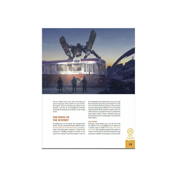 Out of Time propose une campagne en trois scénarios pour le jeu de rôle Tales from the Loop, proposant également des accroches de scénarios et un générateurs de Mystères.