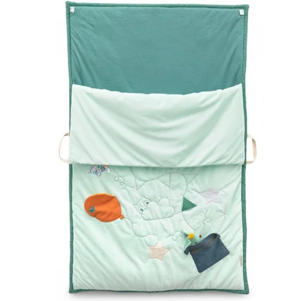 Sur ce tapis de jeu doux et joliment illustré, vous rencontrerez Joe le dragon et ses tours de magie. En compagnie du petit hochet dragon, bébé découvre et explore les nombreuses activités comme des bruits, des parties à soulever et des parties phosphorescentes. Lorsque bébé grandit, le tapis de jeu se transforme en un sac de couchage confortable pour un doux sommeil. Grâce aux poignées, il est facile à emporter. 2 en 1 : un tapis de jeu qui évolue avec votre bébé et devient un sac de couchage.