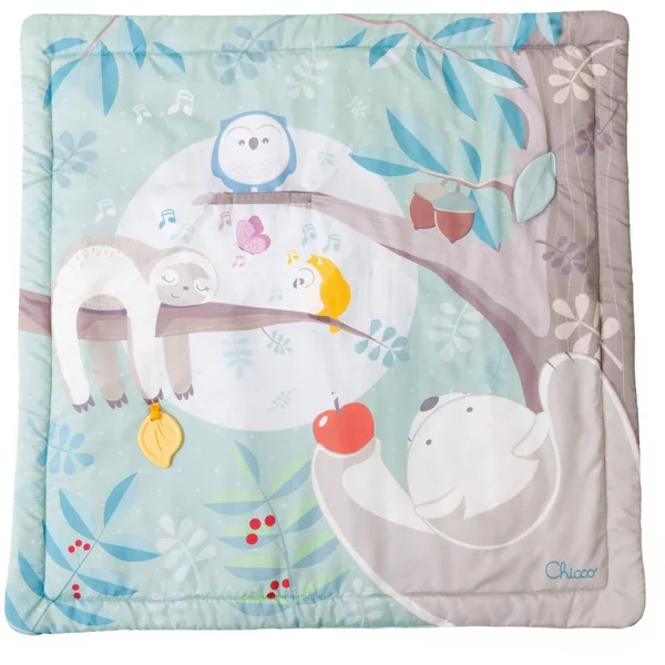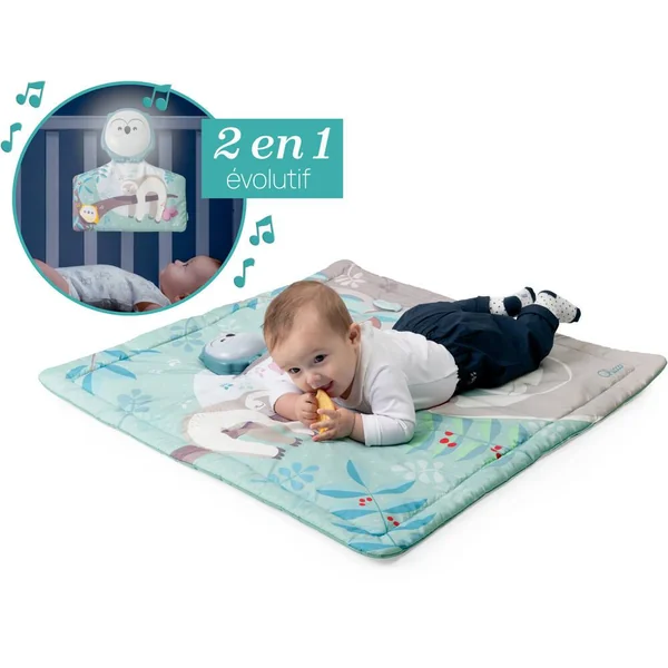 Un tapis d’éveil 2 en 1 pour deux modes d’utilisation. Le jour, le tapis stimule bébé avec les sons et lumières provenant du module électronique et des déclencheurs interactifs. Un jouet de dentition est également inclu avec le tapis. La nuit, la veilleuse et la partie textile, détachables, accompagnent bébé au moment du couché avec des cycles de 20 minutes de musique classique et des lumières tamisées.