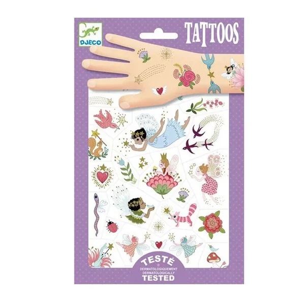 Deux planches de tatouages temporaires sur le thème des fées. Pour le plus grand plaisir des enfants, ils sont parsemés de petits détails dorés ! Faciles à utiliser, ils sont prédécoupés et s’appliquent avec un peu d’eau. Testés dermatologiquement.