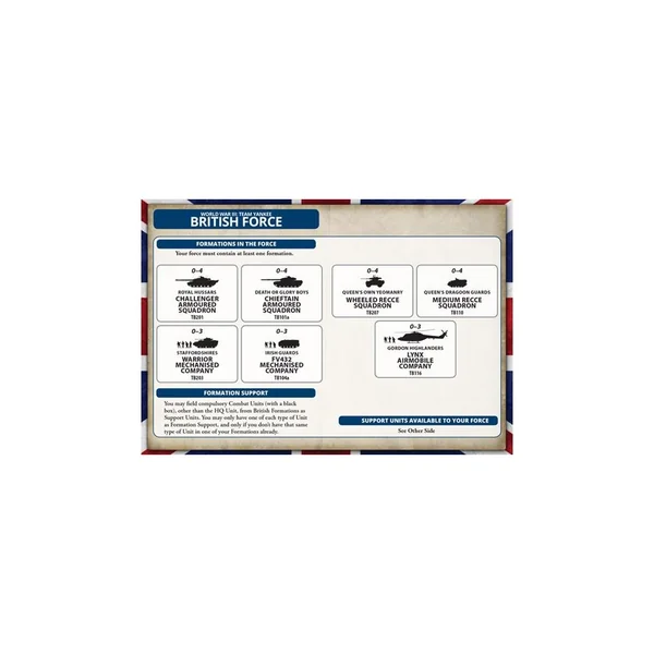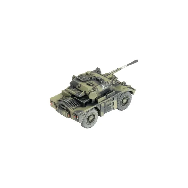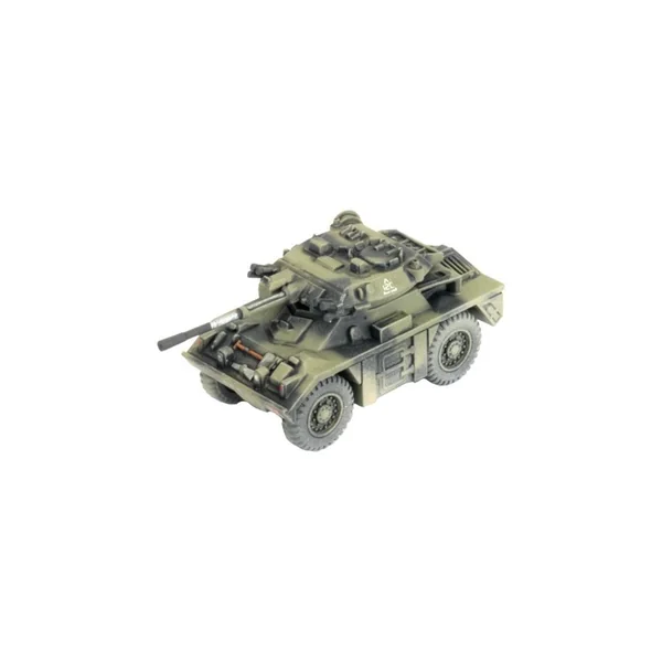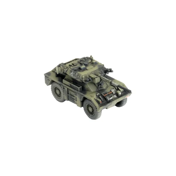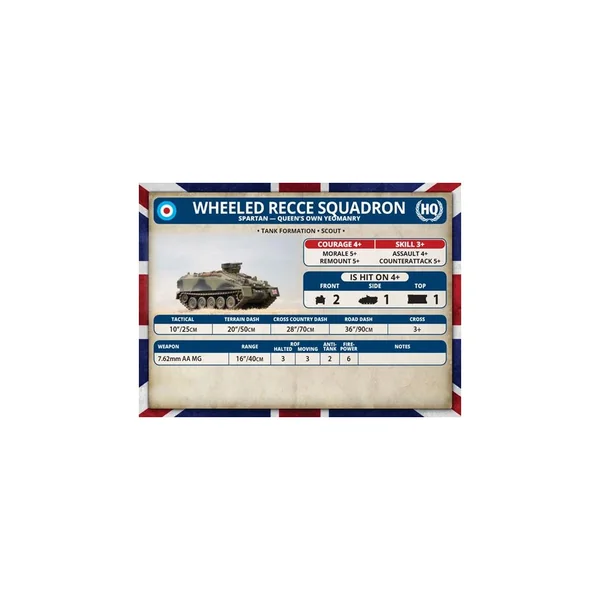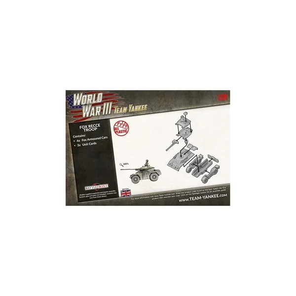 La boîte Fox Recce Troop contient 4 véhicules blindés Fox en plastique et trois cartes d’unités.