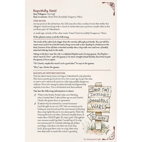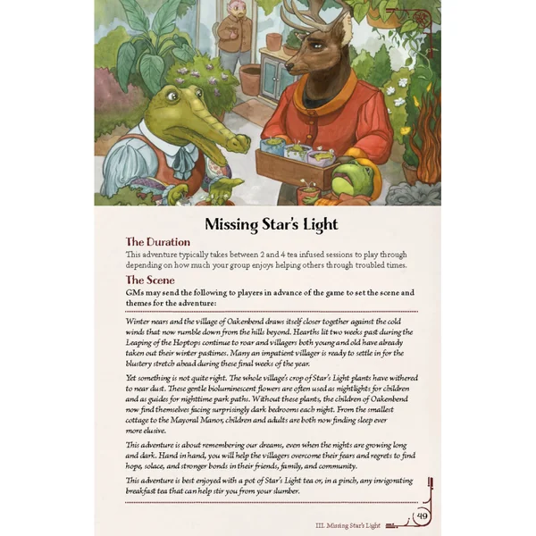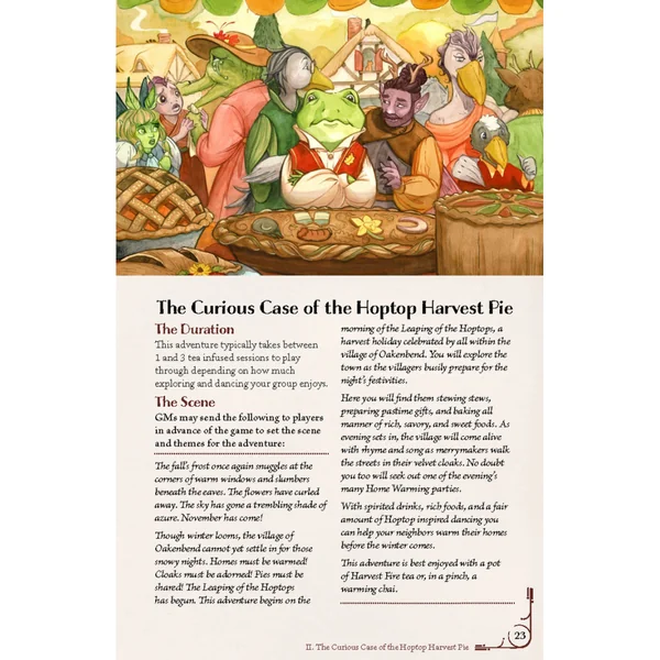 Ce livre comprend 200 pages d’aventures douillettes pour le système Teatime Adventures, incluant 4 aventures complètes et des recettes situées dans le village chaleureux d’Oakenbend. Vous y découvrirez plus de 35 habitants sympathiques ainsi que plus de 30 lieux et boutiques accueillants à explorer dans le village. Ces aventures ont été entièrement révisées pour la 2ᵉ édition de Teatime Adventures, avec de nouveaux personnages et d’adorables « tea pets » sauvages disséminés un peu partout !