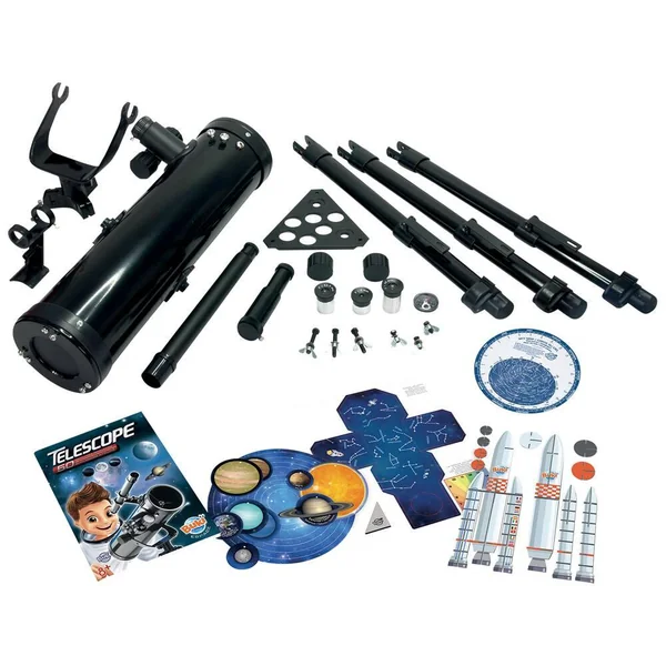 Télescope réflecteur avec notice et accessoires : miroir de 76 mm de diamètre, objectif chercheur de 6 x 25 mm, 3 oculaires interchangeables, 1 lentille de Barlow 3x. Trépied sol de 76 cm monture azimutale.