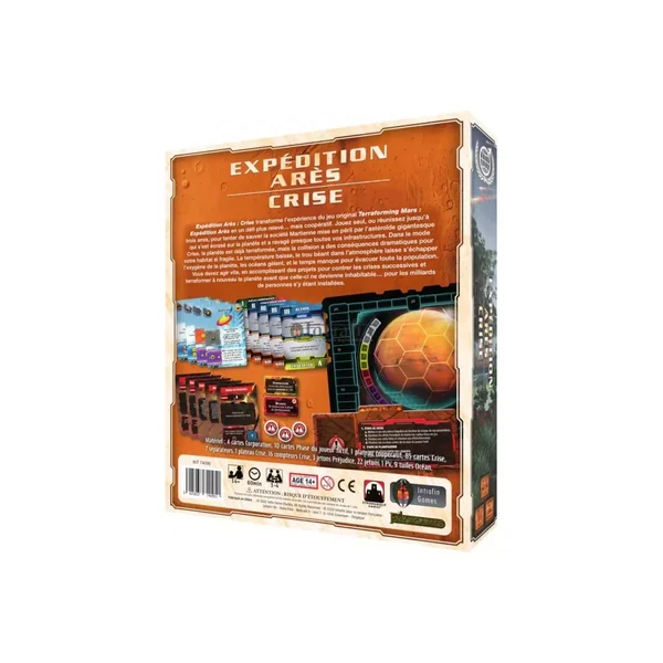 Terraforming Mars : Expédition Arès : Crise – Extension : Dans le mode Crise, la planète est déjà terraformée, mais la collision a des conséquences dramatiques pour votre habitat si fragile. La température baisse, le trou béant dans l’atmosphère laisse s’échapper l’oxygène de la planète, les océans gèlent, et le temps manque pour évacuer toute la population.