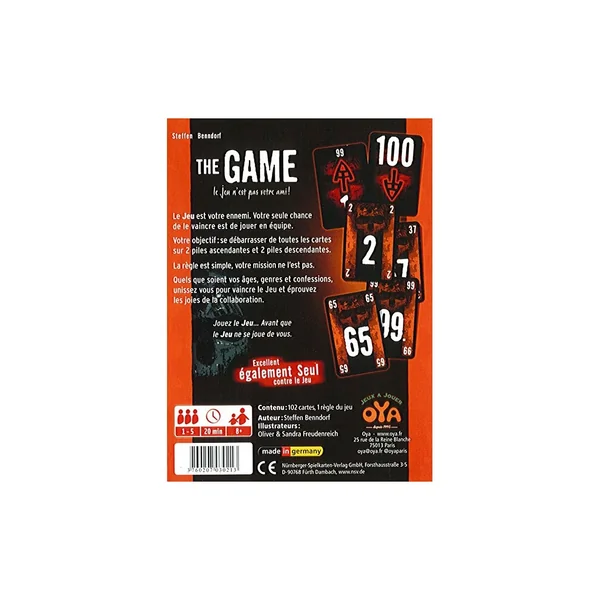 The Game est un jeu de cartes coopératif de 1 à 5 joueurs dans lequel les joueurs s’unissent tous ensemble dans le but de parvenir à poser toutes les cartes sur 4 piles : 2 ascendantes, 2 descendantes. Pour les aider dans cette tâche, les joueurs pourront faire des sauts en arrière de 10. Mais cela suffira-t-il pour vaincre le jeu, sachant qu’ils ne pourront communiquer la valeur de leurs cartes en main ?