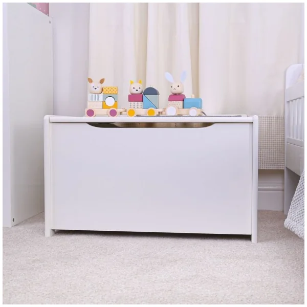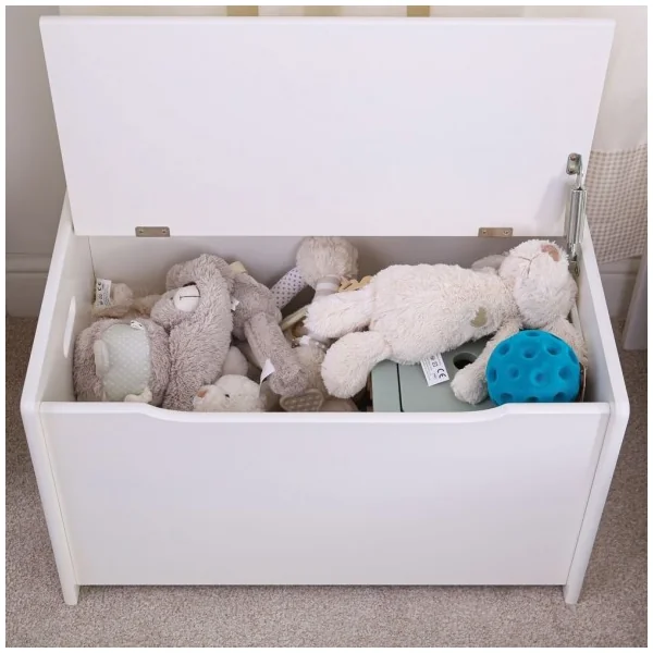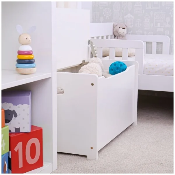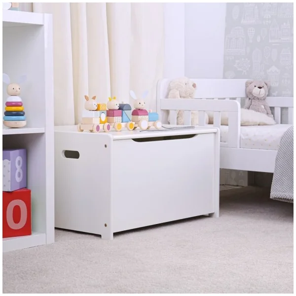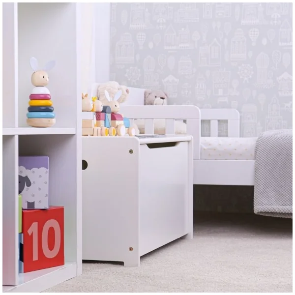 Gardez vos jouets, vêtements ou couettes rangés et facilement accessibles avec ce beau coffre en bois. Il a un design blanc simple et un grand volume, ce qui incitera les enfants à ranger leurs jouets. Idéal pour les petites mains, ce banc dispose d’un mécanisme qui protège les petits doigts lors de la fermeture, et il a des poignées sur les côtés pour une prise en main facile.