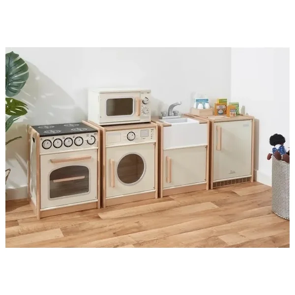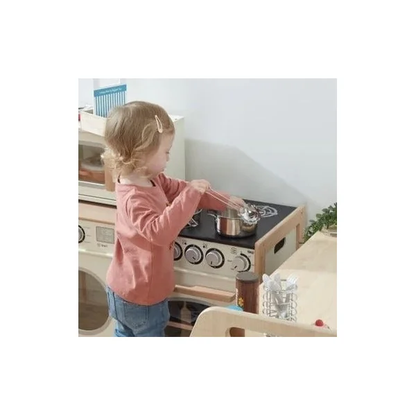 Les jeunes chefs en herbe s’amuseront à cuisiner et à pâtisser avec ce poêle en bois au style campagnard ! Il comprend des cadrans rotatifs et cliquables, des plaques de cuisson, un four avec un « plateau » amovible. Les portes faciles à ouvrir comportent également une fenêtre pour que les jeunes chefs puissent vérifier la cuisson des aliments sans les brûler ! Un excellent moyen d’apprendre aux enfants à cuisiner différents plats et à respecter la sécurité en cuisine. Sur le côté, il y a des poignées pour une prise en main plus facile. Il favorise le jeu créatif et imaginatif. Combinez-le avec d’autres appareils de cuisine Tidlo et créez une cuisine ludique !