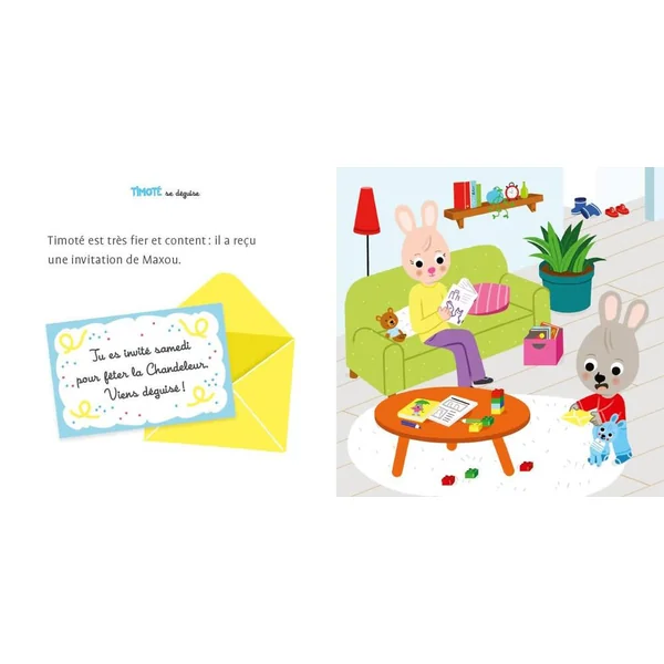 Timoté est un petit lapin qui, au fil des albums, partage sa vie avec ses copains et sa famille.Aujourd’hui, Timoté a reçu une invitation pour aller fêter la Chandeleur ! Qu’est-ce que c’est ? demande-t-il à sa maman.Une histoire à raconter avant de faire des crêpes ! Et pour se déguiser, un masque à découper ! Nouveau : votre enfant peut désormais écouter gratuitement la version audio de l’histoire via l’application Lizzie en scannant le QR code à retrouver dans le livre !