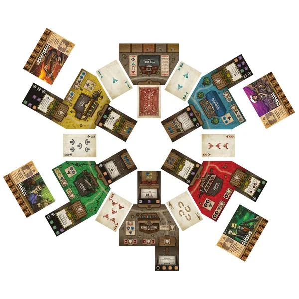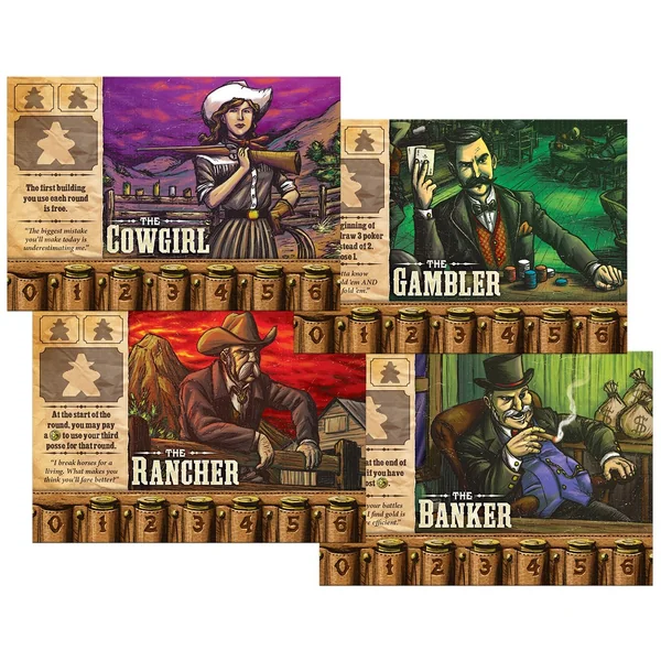 Le jeu se joue en une série de tours. Chaque tour, des cartes de poker sont distribuées entre les différents lieux, qui sont disposés en cercle. Les joueurs placent les membres de la troupe sur ces cartes de lieux, ce qui donne une action et compte comme une enchère pour les ressources précieuses du lieu. Les joueurs reçoivent également une carte de poker qui utilise les deux cartes adjacentes d’un emplacement pour former une main à trois cartes. Ceci crée un mélange astucieux de placement d’ouvrier moderne et de poker qui est le moteur du jeu. En outre, les joueurs doivent gérer leurs ressources de Loi, d’Argent et de Force pour acheter des bâtiments et des fusillades. Si vous avez la mise la plus élevée dans l’industrie la plus lucrative à la fin, vous serez récompensé par des points bonus. Ajoutez ces points aux points que vous avez accumulés en achetant des bâtiments et déterminez le gagnant ! Yippie kay yay yay a !