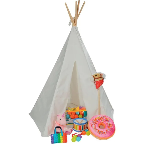 Tipi blanc avec 6 pans, de 183 cm de haut. Tissu : 100% coton. Avec 6 piquets en bois : 12 pièces en bois avec 6 connecteurs en plastique. Avec un lien pour fermer l’entrée du tipi. Livré sans tapis de sol. A assembler. Chaque pan fait 1 mètre de long au sol. Le tissu n’est pas imperméable, il ne convient pas pour la pluie. L’assemblage doit être fait par un adulte. Instructions d’assemblage incluses. Dimensions montée (emprise au sol) : Longueur 197 x largeur 173 x hauteur 183 cm.