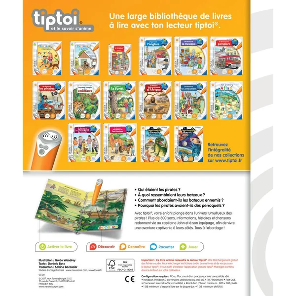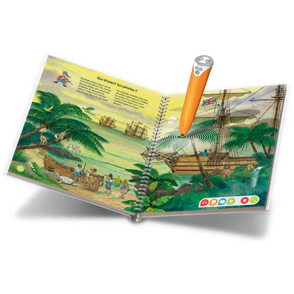 Qui étaient les pirates? A quoi ressemblaient leurs bateaux ?Pourquoi les pirates avaient-ils des perroquets ? Plus de 800 sons, informations,histoires et chansons redonnent vie au capitaine John et à son équipage, afin de vivre une aventure captivante à leurs côtés. Je découvre les pirates est un livre interactif accessible dès 4 ans. Fonctionne uniquement avec le lecteur tiptoi®, vendu séparément. tiptoi® est un lecteur éducatif interactif qui permet aux enfants de découvrir le monde de facon ludique et autonome. Lorsque l’enfant pointe le lecteur sur une image ou un texte, il entend des sons, des informations, des personnages ou de la musique. tiptoi® apporte une dimension nouvelle au contenu pédagogique des supports : que ce soit dans les livres, les jeux ou le globe, l’enfant n’a qu’à pointer le lecteur dessus et tout s’anime comme par magie ! La collection de livres interactifs tiptoi® Qui ? Pourquoi ? Comment ? répond de manière adaptée aux questions essentielles des enfants. Les informations factuelles sont expliquées en fonction de l’âge des enfants et validées par des spécialistes. Ce produit est composé de matériaux issus de forêts bien gérées certifiées FSC®, de matériaux recyclés et de matériaux issus d’autres sources contrôlées (FSC-C111262).