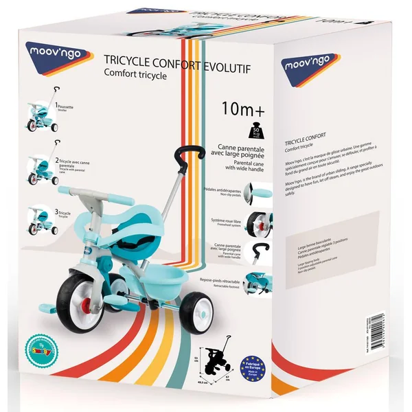 Tricycle 3 en 1, complet. Adapté pour les plus petits. Avec 3 évolutions possibles : 1) poussette (avec arceau de sécurité), 2) tricycle avec canne parentale et 3) tricycle. Cadre 100% métal. Siège enveloppant réglable sur 2 positions et équipé d’une ceinture de sécurité. Canne parentale avec large poignée : amovible et réglable sur 3 positions (hauteur maximum 100 cm). Pédales antidérapantes. Repose-pieds rétractable. Arceau de sécurité amovible. Système roue libre. Blocage de direction. Benne basculante. Roues en gomme silencieuses et anti-dérapantes. Conçu et fabriqué par Smoby. Tricycle évolutif accompagnant l’enfant de 10 mois à plus de 3 ans. Poids maximum de l’utilisateur : 50 kg. Notice de montage incluse. Fabrication espagnole. Coloris : T MIMI.