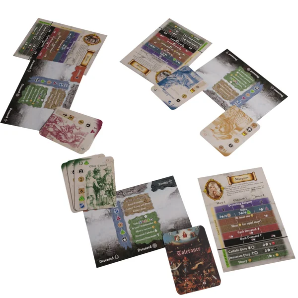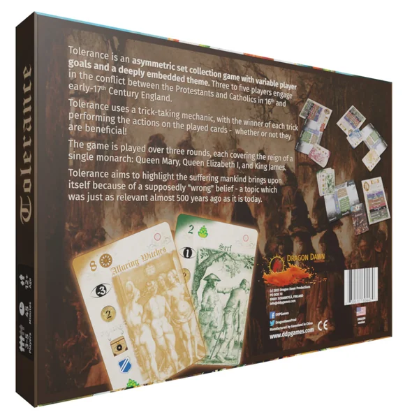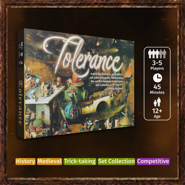 Tolerance est un jeu de collection asymétrique avec des objectifs de joueurs variables et un thème profondément ancré. Trois à cinq joueurs s’engagent dans le conflit entre les protestants et les catholiques dans l’Angleterre du XVIe et du début du XVIIe siècle. Tolerance utilise une mécanique de levée de pli, le gagnant de chaque pli effectuant les actions indiquées sur les cartes jouées – qu’elles soient bénéfiques ou non !