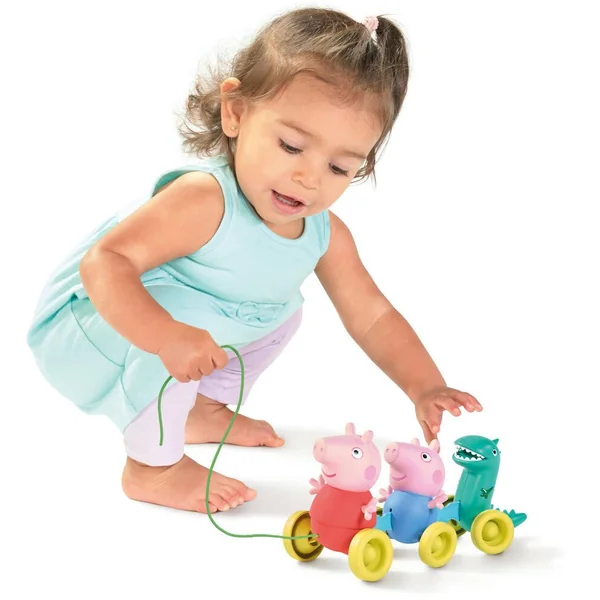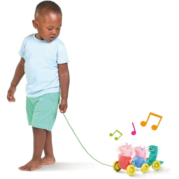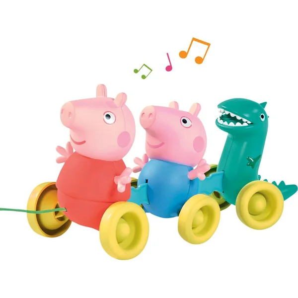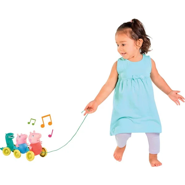 Et si on partait en promenade avec Peppa ? Voici un jouet à tirer qui fait la joie des tout petits ! Lorsque bébé tire sur la ficelle, Peppa, George et leur dino préféré se dandinent joyeusement sur un air amusant et émettent des petits grognements rigolos.