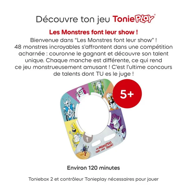 Inclus dans ce jeu : 1 disque Tonieplay « Les monstres font leur show » et 6 cartes monstres.