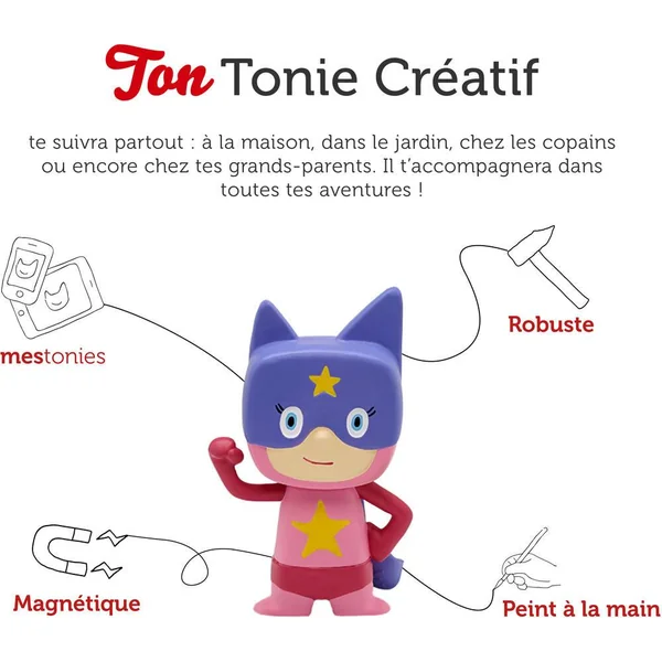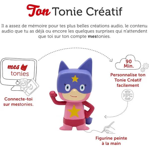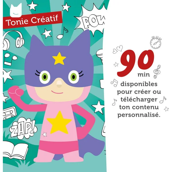 Figurines attachantes et hautes en couleur, les TONIES®s Créatifs ont le super-pouvoir de restituer jusqu’à 90 minutes de contenus de ton choix sur ta TONIES®box (vendue séparément). Des contenus qui peuvent être gérés directement depuis ton espace mes.TONIES®s.com et même créés de toute pièce grâce à la fonction Enregistrement de l’application gratuite mesTONIES®s, disponible sur smartphones et tablettes. Une histoire avec la voix de Papa ou la playlist préférée de Maman, il ne te reste plus qu’à choisir ta prochaine aventure !