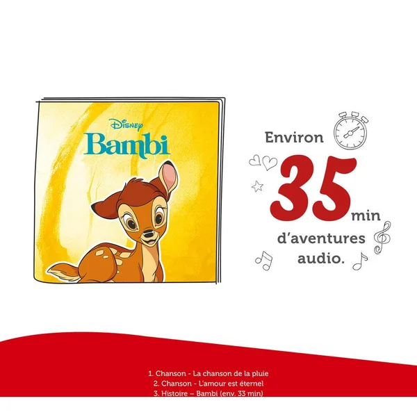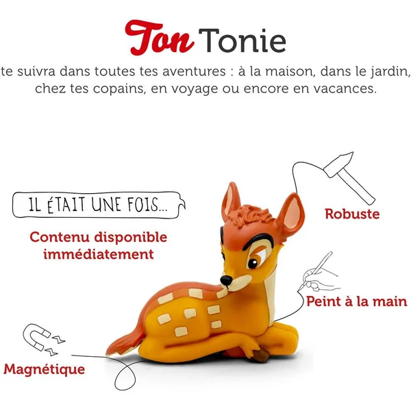 Avec votre figurine TONIES® Bambi et votre TONIES®box (vendue séparément), embarquez pour une aventure audio unique (env. 35 min), inspirée de l’histoire originale du célèbre film de Disney et incluant les chansons les plus emblématiques (La chanson de la pluie ET L’amour est éternel). Et une fois l’aventure terminée, prolongez l’expérience de jeu dans le monde réel avec cette attachante figurine peinte à la main.