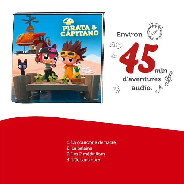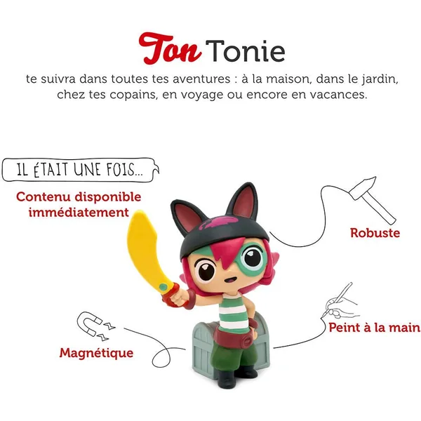 Avec votre figurine TONIES® Pirata et votre TONIES®box (vendue séparément), Secondée par son ami Capitano et son fidèle équipage, Pirata sillonne sans relâche le Grand Océan à la recherche d’un trésor enfoui, toujours en quête de nouvelles aventures. Avec Pirata, quand l’aventure va, tout va !