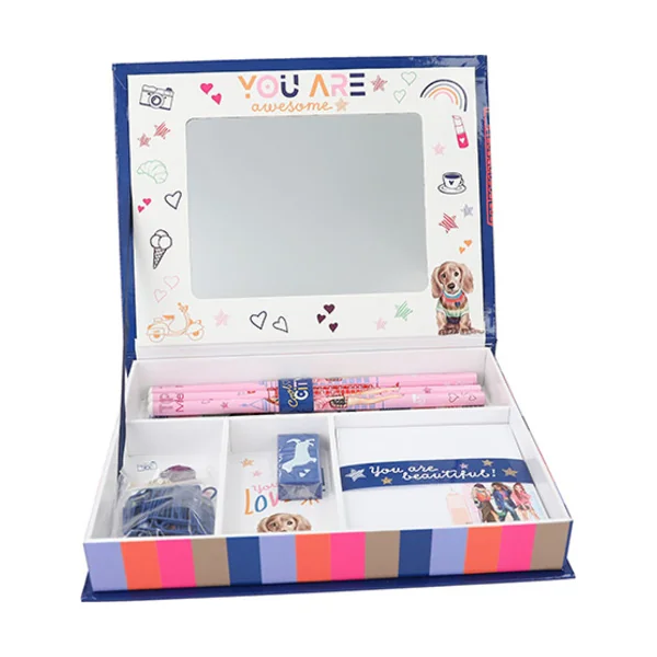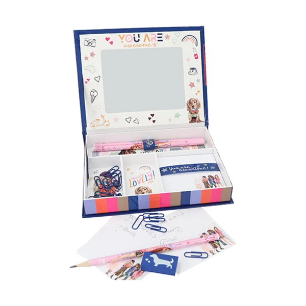 Le set est équipé de trois crayons colorés avec de jolis motifs, d’une gomme imprimée, de 25 trombones roses et d’un bloc-notes rose de 100 pages. Un miroir se trouve sur le couvercle de la boîte.