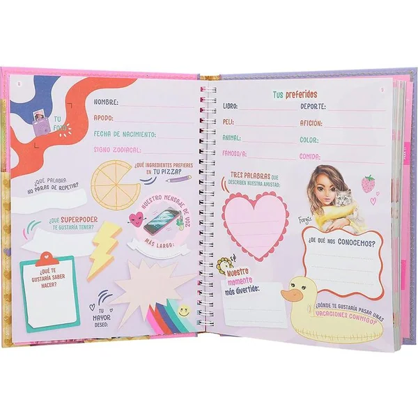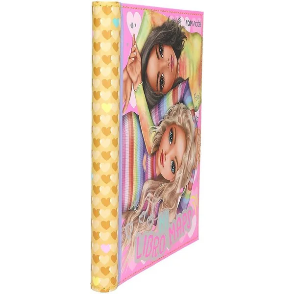 Le livre d’amitié TOPModel « Mi Libro Maps » est un excellent moyen de conserver des souvenirs d’amis et d’amies. Les couvertures rigides en matériau durable sont imprimées d’un magnifique motif détaillé de deux TOPModeles – Candy et Fergie – vêtues de pulls arc-en-ciel coordonnés, avec de délicats détails de cœurs et d’étoiles.