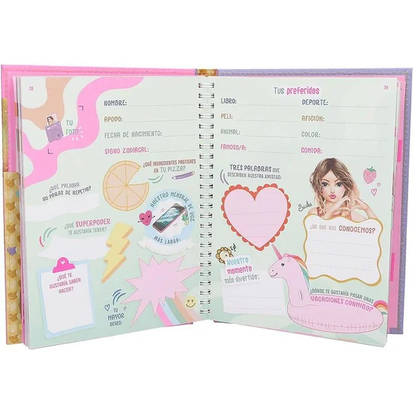 Le peigne est orné de motifs de cœurs dorés, qui donnent au livre un aspect luxueux. À l’intérieur du livre, des pages thématiques sont prêtes à être remplies de détails, de messages, d’images et de petits secrets, le tout en espagnol.